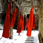 This photograph depicts an art display called The REDress Project at the National Museum of the American Indian. The artist, Jaime Black, created the REDress Project to draw attention to the nature of violent crimes against Native women, and to create a presence, through absence.